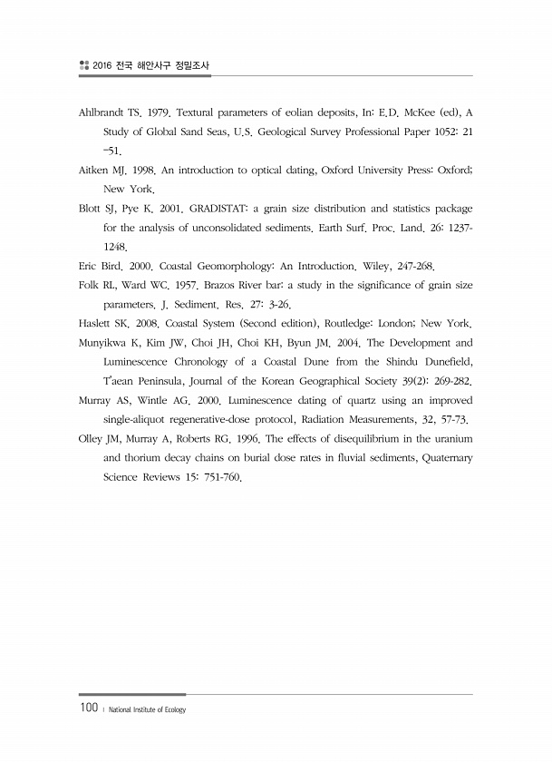 2016 전국 해안사구 정밀조사 100 ? National Institute of Ecology Ahlbrandt TS. 1979. Textural parameters of eolian deposits, InE.D. McKee ed , A Study of Global Sand Seas, U.S. Geological Survey Professional Paper 105221 ?51. Aitken MJ. 1998. An introduction to optical dating, Oxford University PressOxford; New York. Blott SJ, Pye K. 2001. GRADISTATa grain size distribution and statistics package for the ana...