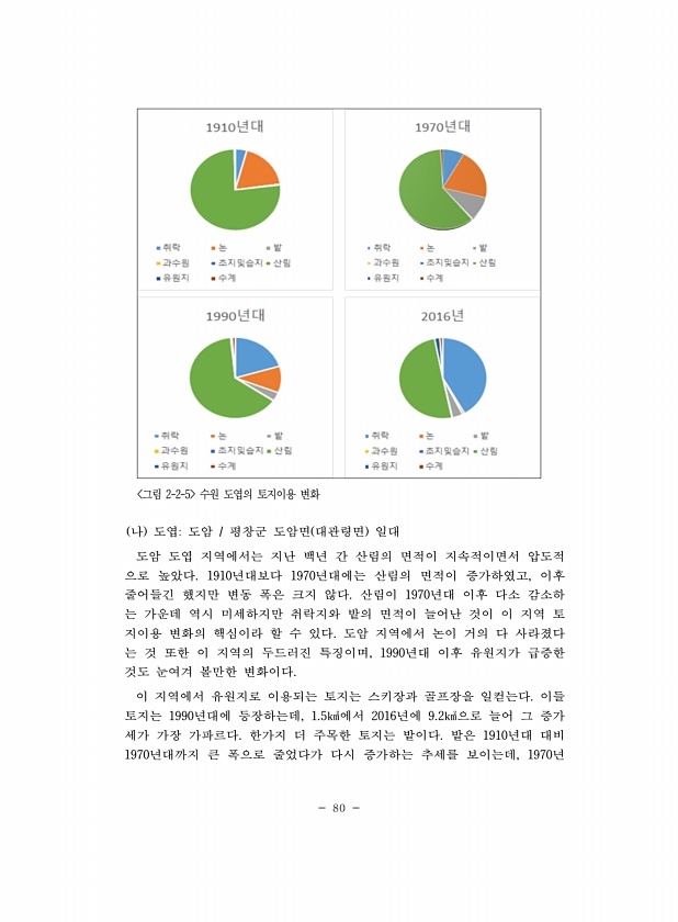 80 그림 2-2-5 수원 도엽의 토지이용 변화 나 도엽도암 평창군 도암면 대관령면 일대 도암 도엽 지역에서는 지난 백년 간 산림의 면적이 지속적이면서 압도적 으로 높았다. 1910년대보다 1970년대에는 산림의 면적이 증가하였고, 이후 줄어들긴 했지만 변동 폭은 크지 않다. 산림이 1970년대 이후 다소 감소하 는 가운데 역시 미세하지만 취락지와 밭의 면적이 늘어난 것이 이 지역 토 지이용 변화의 핵심이라 할 수 있다. 도암 지역에서 논이 거의 다 사라졌다 는 것 또한 이 지역의 두드러진 특징이며, 1990년대 이후 유원지가 급증한 것도 눈여겨 볼만한 변화이다. 이 지역에서 유원지로 이용되는 토지는 스키장과 골프장을 일컫는다. 이들 토지는 1990년대에 등장하는데, 1.5㎢에서 2016년에 9.2㎢으로 늘...