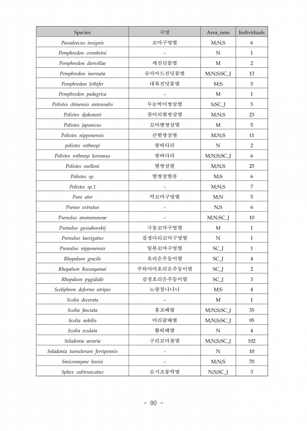 Species Area_nms Individuals Passaloecus insignis ? M;N;S 6 Pemphredon crombeini N 1 Pemphredon diervillae M 2 Pemphredon inornata M;N;S;SC_J 13 Pemphredon lethifer M;S 5 Pemphredon padagrica M 1 Polistes chinensis antennalis S;SC_J 5 Polistes djakonovi M;N;S 23 Polistes japonicus ? M 5 Polistes nipponensis M;N;S 11 polistes rothneyi N 2 Polistes rothneyi koreanus M;N;S;SC_J 6 Polistes snelleni M;...