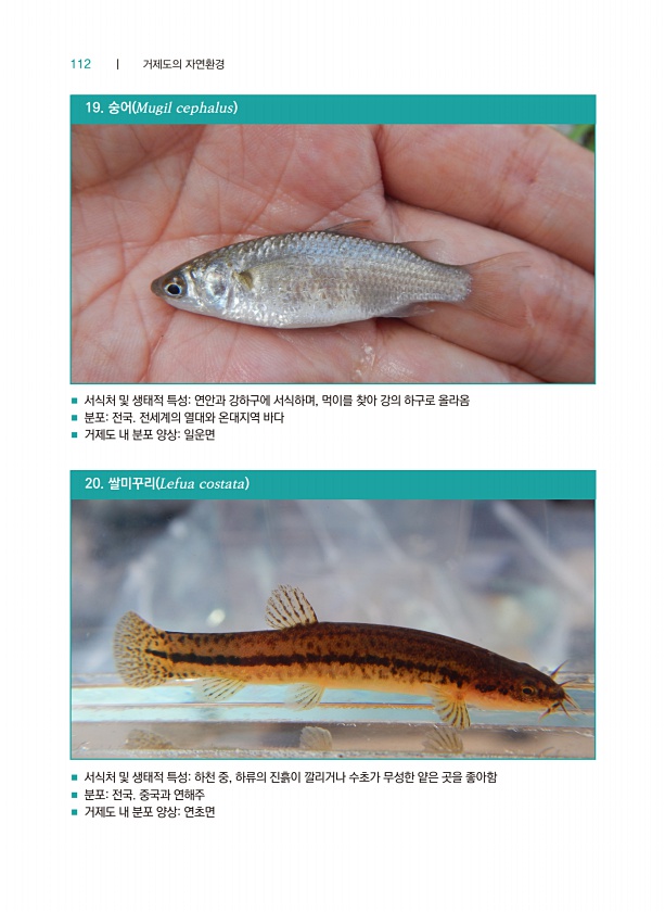112 ┃ 거제도의 자연환경 ■ 서식처 및 생태적 특성연안과 강하구에 서식하며, 먹이를 찾아 강의 하구로 올라옴 ■ 분포전국. 전세계의 열대와 온대지역 바다 ■ 거제도 내 분포 양상일운면 ■ 서식처 및 생태적 특성하천 중, 하류의 진흙이 깔리거나 수초가 무성한 얕은 곳을 좋아함 ■ 분포전국. 중국과 연해주 ■ 거제도 내 분포 양상연초면 19. 숭어 Mugil cephalus 20. 쌀미꾸리 Lefua costata