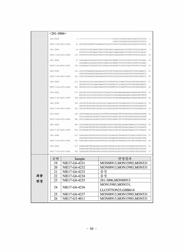98 281-3006 최종 판정 순번 Sample 판정결과 19 NIE17-G6-4231 MON88913,MON15985,MON531 20 NIE17-G6-4232 MON88913,MON15985,MON531 21 NIE17-G6-4233 음성 22 NIE17-G6-4234 음성 23 NIE17-G6-4235 281-3006,MON88913 24 NIE17-G6-4236 MON15985,MON531, LLCOTTON25,GHB614 25 NIE17-G6-4237 MON88913,MON15985,MON531 26 NIE17-G3-4011MON88913,MON15985,MON531