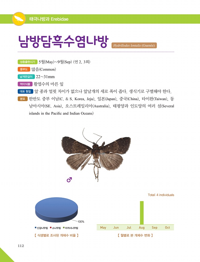 112 태극나방과 Erebidae 성충출현시기 5월 May 9월 Sep 연 2, 3회 풍부도 많음 Common 날개편길이 2231mm 먹이식물 활엽수의 마른 잎 대표 형질 앞 종과 얼핏 차이가 없으나 앞날개의 세로 폭이 좁다. 생식기로 구별해야 한다. 분포 한반도 중부 이남 C. & S. Korea, Jeju , 일본 Japan , 중국 China , 타이완 Taiwan , 동 남아시아 SE. Asia , 오스트레일리아 Australia , 태평양과 인도양의 여러 섬 Several islands in the Pacifc and Indian Oceans 남방담흑수염나방 Hydrillodes lentalis Guen?e 【 월별로 본 개체수 변화 】 Total4 individuals 【 식생별로 조사된 개체수 ...