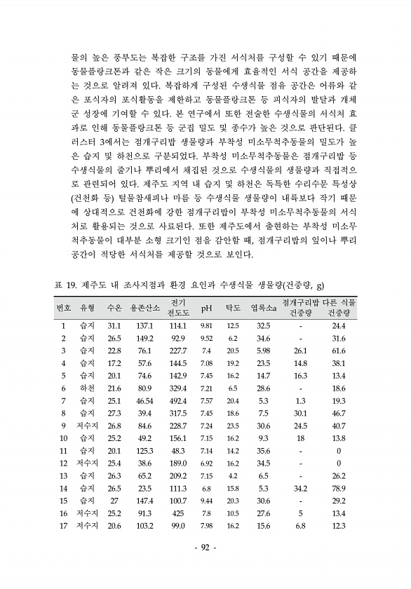 92 번호 유형 수온 용존산소 전기 전도도 pH 탁도 엽록소a 점개구리밥 건중량 다른 식물 건중량 1 습지 31.1 137.1 114.1 9.81 12.5 32.5 24.4 2 습지 26.5 149.2 92.9 9.52 6.2 34.6 31.6 3 습지 22.8 76.1 227.7 7.4 20.5 5.98 26.1 61.6 4 습지 17.2 57.6 144.5 7.08 19.2 23.5 14.8 38.1 5 습지 20.1 74.6 142.9 7.45 16.2 14.7 16.3 13.4 6 하천 21.6 80.9 329.4 7.21 6.5 28.6 18.6 7 습지 25.1 46.54 492.4 7.57 20.4 5.3 1.3 19.3 8 습지 27.3 39.4 317.5 7.45 18.6 7.5 30.1 4...