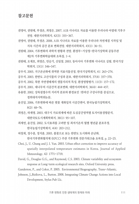 기후 변화로 인한 생태계의 현재와 미래 111 참고문헌 권영아, 권원태, 부경온, 최영은. 2007. A1B 시나리오 자료를 이용한 우리나라 아열대 기후구 전망. 대한지리학회지. 42 3 355-367. 권영아, 권원태, 부경온. 2008. A1B 시나리오 자료를 이용한 우리나라 자연계절 시작일 및 지속 시간의 공간 분포 변화전망. 대한지리학회지. 43 1 36-51. 권원태. 2004. 기후변화의 과학적 현황과 전망. 환경부-기상청-한국기상학회 공동주관 제2차 기후변화학술대회 초록집. 1-4. 권원태, 오재호, 최영은, 민승기, 신임철. 2003. 동아시아 기후변화 시나리오 실험. 한국기상 학회지. 13 1 546-547. 공우석. 2005. 지구온난화에 취역한 지표식물선정. 한국기상학회지, 41263-2...