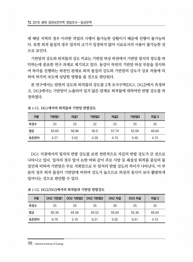 2018 생태·경관보전지역 정밀조사 동강유역 98 ? National Institute of Ecology 데 해당 지역의 경우 이러한 작업의 시행이 불가능한 상황이기 때문에 진행이 불가능하 다. 또한 퇴적 물질의 경우 입자의 크기가 일정하지 않아 시료로서의 사용이 불가능한 것 으로 보인다. 기반암의 강도와 퇴적물의 강도 비교는 기반암 하상 하천에서 기반암 침식의 정도를 파 악하는데 중요한 연구 과제로 제기되고 있다. 동강이 하천의 기반암 하상 부분을 침식하 여 하각을 진행하는 하천인 관계로 퇴적 물질의 강도와 기반암의 강도가 상호 작용에 의 하여 하각의 속도에 상당한 영향을 줄 것으로 판단된다. 본 연구에서는 암반의 강도와 퇴적물의 강도를 2개 조사구역 DG1, DG2 에서 측정하 고, DG3에서는 기반암...