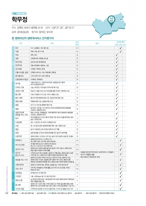 No. 속초- 본 생태자산의 생태계서비스 간이평가지 구분 예시 평가 등급 설명 규모별 혜택 지점 지역 국가 공급 담수 식수, 농업용수, 축산 용수 등 ++ √ 식량 곡물, 과실, 물고기 등 ++ √ 연료 화목, 토탄 0 √ 섬유 건축용 목재, 의류용 섬유 등 0 √ 유전자원 농업·축산업 희귀품종 등 0 √ 천연약재 전통 의약품에 사용되는 식물 0 √ 장식재료 수집용 조개껍질, 꽃 등 0 √ 진흙,미네랄, 골재 건축용 모래 또는 자갈, 벽돌재료 진흙 등 + √ 폐기물처리 고체 쓰레기 하치, 폐수 방류 등 0 √ 친환경에너지발전 조력발전, 풍력발전 0 √ 조절 대기질 자동차 배기가스, 산업체 대기오염, 농업발생 먼지 등의 대기 미세물질의 제거 0 √ 지역적 기후 그늘, 대기온도 저하 등의 지역 미세기후 조절 0...