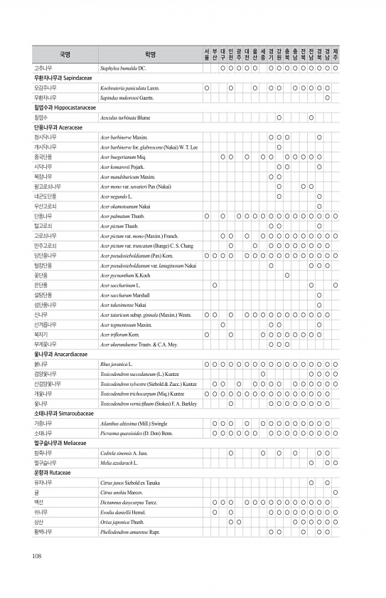 108 고추나무 Staphylea bumalda DC. ○ ○ ○ ○ ○ ○ ○ ○ ○ ○ ○ ○ ○ ○ 무환자나무과 Sapindaceae 모감주나무 Koelreuteria paniculata Laxm. ○ ○ ○ ○ ○ ○ ○ ○ ○ ○ 무환자나무 Sapindus mukorossi Gaertn. ○ 칠엽수과 Hippocastanaceae 칠엽수 Aesculus turbinata Blume ○ ○ 단풍나무과 Aceraceae 청시닥나무 Acer barbinerve Maxim. ○ ○ ○ ○ 개시닥나무 Acer barbinerve for. glabrescens Nakai W. T. Lee ○ 중국단풍 Acer buegerianum Miq. ○ ○ ○ ○ ○ ○ ○ ○ ○ ○ 시닥나무 Acer komarovii...