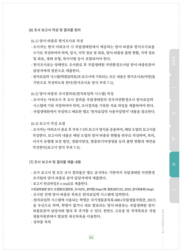113 제5차 전국자연환경조사 지침 6 조사?보고서?작성?및?결과물?정리 ?.? 양서·파충류?현지조사표?작성 조사자는?현지?야외조사?시?국립생태원에서?제공하는?양서·파충류?현지조사표를 수기로?작성하여야?하며, 일시, 지역?정보?및?좌표, 양서·파충류?출현?현황, 지역?정보 및?좌표, 생태?유형, 특이사항?등이?포함되어야?한다. 현지조사표는?당해연도?조사완료?후?국립생태원?자연환경조사팀?양서·파충류분야 담당자에게?원본으로?제출한다. 원자료입력?시스템 엑셀입력표 과?보고서에?기록되는?모든?내용은?현지조사표 야장 를 기반으로?작성하도록?한다 현지조사표?양식?부록 ?-? ?.? 양서·파충류?조사결과표 원자료입력?시스템 작성 조사자는?야외조사?후?조사?결과를?국립생태원의?전국자연환경조사?원자료입력 시스템에?기록?저장...