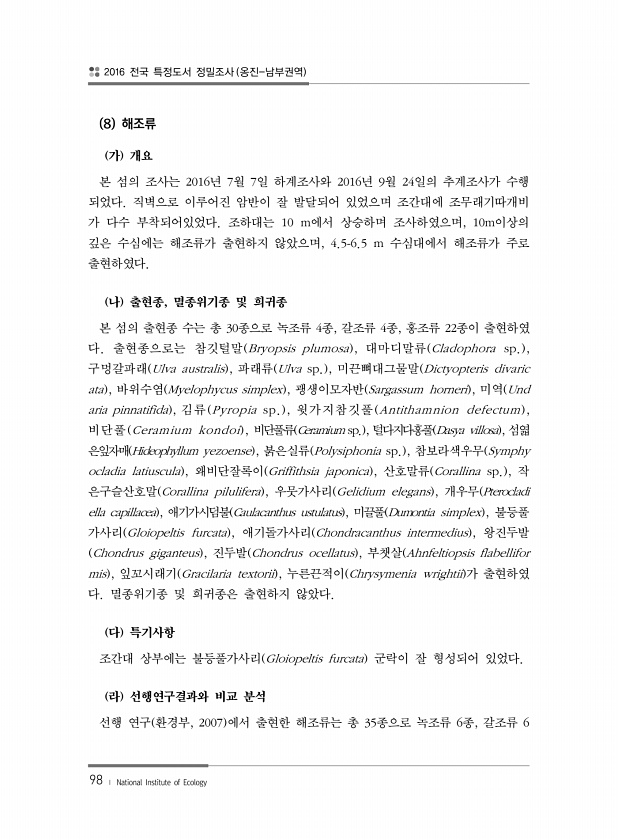2016 전국 특정도서 정밀조사 옹진-남부권역 98 ? National Institute of Ecology 8 해조류 가 개요 본 섬의 조사는 2016년 7월 7일 하계조사와 2016년 9월 24일의 추계조사가 수행 되었다. 직벽으로 이루어진 암반이 잘 발달되어 있었으며 조간대에 조무래기따개비 가 다수 부착되어있었다. 조하대는 10 m에서 상승하며 조사하였으며, 10m이상의 깊은 수심에는 해조류가 출현하지 않았으며, 4.5-6.5 m 수심대에서 해조류가 주로 출현하였다. 나 출현종, 멸종위기종 및 희귀종 본 섬의 출현종 수는 총 30종으로 녹조류 4종, 갈조류 4종, 홍조류 22종이 출현하였 다. 출현종으로는 참깃털말 Bryopsis plumosa , 대마디말류 Cladophora sp. , 구멍갈파래 U...