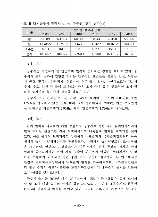 90 구 분 연도별 경작지 면적 2008 2009 2010 2011 2012 2013 밭 6,120.9 6,116.3 6,091.4 6,093.4 5,545.8 5,514.8 논 11,786.5 11,759.8 11,675.8 11,642.7 10,468.2 10,465.4 과수원 161.3 161.1 160.9 162.7 156.3 156.8 합계 18,068.7 18,037.2 17,928.1 17,898.8 16,170.3 16,137 표 공주시 경작지 밭 논 과수원 면적 변화 다 초지 공주시는 자연초지 및 인공초지 면적이 증가하는 경향을 보이고 있다 공 주시의 초지 변화에 영향을 미치는 인공적인 요소들은 골프장 건설 목장용 지 변경 벌목지 산화적지 유휴지의 유무 등이 있다 자연적으로는 강 저 수지 수...