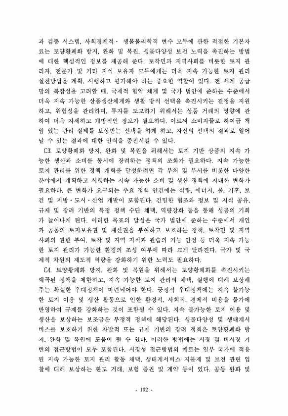 과 검증 시스템, 사회경제적· 생물물리학적 변수 모두에 관한 적절한 기본자 료는 토양황폐화 방지, 완화 및 복원, 생물다양성 보전 노력을 촉진하는 방법 에 대한 핵심적인 정보를 제공해 준다. 토착민과 지역사회를 비롯한 토지 관 리자, 전문가 및 기타 지식 보유자 모두에게는 더욱 지속 가능한 토지 관리 실천방법을 계획, 시행하고 평가해야 하는 중요한 역할이 있다. 전 세계 공급 망의 복잡성을 고려할 때, 국제적 협약 체계 및 국가 법안에 준하는 수준에서 더욱 지속 가능한 상품생산체계와 생활 방식 선택을 촉진시키는 결정을 지원 하고, 위험성을 관리하며, 투자를 도모하기 위해서는 상품 거래의 영향에 관 하여 더욱 자세하고 개방적인 정보가 필요하다. 이로써 소비자들로 하여금 책 임 있는 관리 실태를 보상받는 선택을...