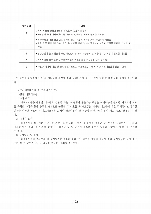 No. 강릉- 강릉 050 본 생태자산의 생태계서비스 간이평가지 구분 예시 평가 등급 설명 규모별 혜택 지점 지역 국가 공급 담수 식수, 농업용수, 축산 용수 등 ++ √ 식량 곡물, 과실, 물고기 등 ++ √ 연료 화목, 토탄 0 √ 섬유 건축용 목재, 의류용 섬유 등 0 √ 유전자원 농업·축산업 희귀품종 등 0 √ 천연약재 전통 의약품에 사용되는 식물 0 √ 장식재료 수집용 조개껍질, 꽃 등 + √ 진흙, 미네랄, 골재 건축용 모래 또는 자갈, 벽돌재료 진흙 등 + √ 폐기물처리 고체 쓰레기 하치, 폐수 방류 등 0 √ 친환경에너지발전 조력발전, 풍력발전 0 √ 조절 대기질 자동차 배기가스, 산업체 대기오염, 농업발생 먼지 등의 대기 미세물질의 제거 + √ 지역적 기후 그늘, 대기온도 저하 등의 지역 미...