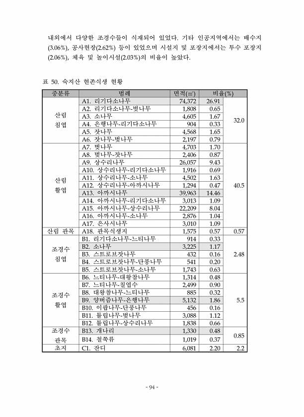 94 내외에서 다양한 조경수들이 식재되어 있었다 기타 인공지역에서는 배수지 공사현장 등이 있었으며 시설지 및 포장지에서는 투수 포장지 체육 및 놀이시설 의 비율이 높았다 중분류 범례 면적 비율 산림 침엽 리기다소나무 리기다소나무 벚나무 소나무 은행나무 리기다소나무 잣나무 잣나무 벚나무 산림 활엽 벚나무 벚나무 잣나무 상수리나무 상수리나무 리기다소나무 상수리나무 소나무 상수리나무 아까시나무 아까시나무 아까시나무 리기다소나무 아까시나무 상수리나무 아까시나무 소나무 은사시나무 산림 관목 관목식생지 조경수 침엽 리기다소나무 느티나무 소나무 스트로브잣나무 스트로브잣나무 단풍나무 스트로브잣나무 소나무 조경수 활엽 느티나무 대왕참나무 느티나무 칠엽수 대왕참나무 느티나무 양버즘나무 은행나무 이팝나무 단풍나무 튤립나무 벚나...