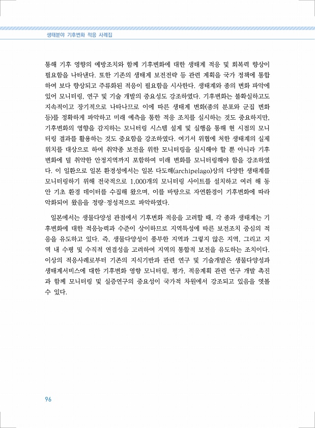 생태분야 기후변화 적응 사례집 96 통해 기후 영향의 예방조치와 함께 기후변화에 대한 생태계 적응 및 회복력 향상이 필요함을 나타낸다. 또한 기존의 생태계 보전전략 등 관련 계획을 국가 정책에 통합 하여 보다 향상되고 주류화된 적응이 필요함을 시사한다. 생태계와 종의 변화 파악에 있어 모니터링, 연구 및 기술 개발의 중요성도 강조하였다. 기후변화는 불확실하고도 지속적이고 장기적으로 나타나므로 이에 따른 생태계 변화 종의 분포와 군집 변화 등 를 정확하게 파악하고 미래 예측을 통한 적응 조치를 실시하는 것도 중요하지만, 기후변화의 영향을 감지하는 모니터링 시스템 설계 및 실행을 통해 현 시점의 모니 터링 결과를 활용하는 것도 중요함을 강조하였다. 여기서 위협에 처한 생태계의 실제 위치를 대상으로 하여 취약종 ...