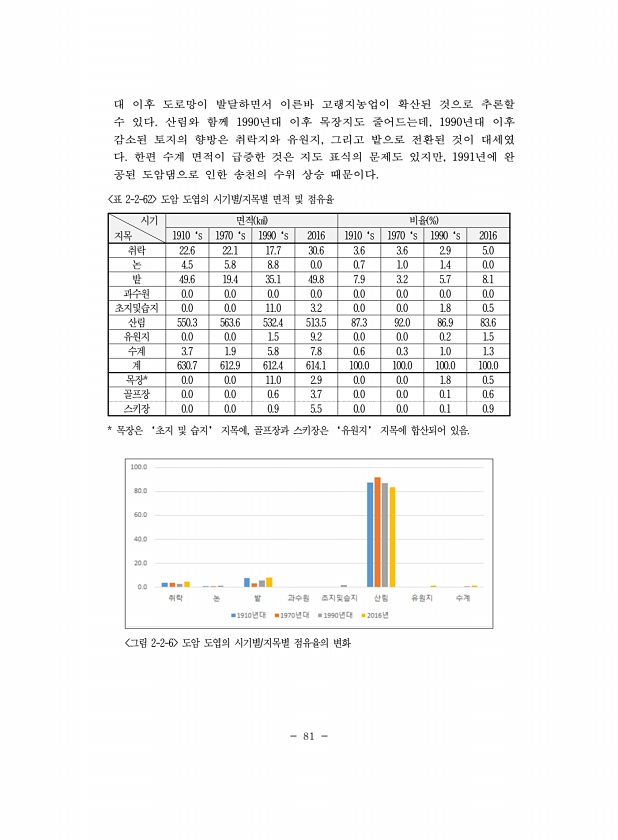 81 대 이후 도로망이 발달하면서 이른바 고랭지농업이 확산된 것으로 추론할 수 있다. 산림와 함께 1990년대 이후 목장지도 줄어드는데, 1990년대 이후 감소된 토지의 향방은 취락지와 유원지, 그리고 밭으로 전환된 것이 대세였 다. 한편 수계 면적이 급증한 것은 지도 표식의 문제도 있지만, 1991년에 완 공된 도암댐으로 인한 송천의 수위 상승 때문이다. 시기 지목 면적 ㎢ 비율 % 1910‘s 1970‘s 1990‘s 2016 1910‘s 1970‘s 1990‘s 2016 취락 22.6 22.1 17.7 30.6 3.6 3.6 2.9 5.0 논 4.5 5.8 8.8 0.0 0.7 1.0 1.4 0.0 밭 49.6 19.4 35.1 49.8 7.9 3.2 5.7 8.1 과수원 0.0 0.0 0.0 0.0 ...