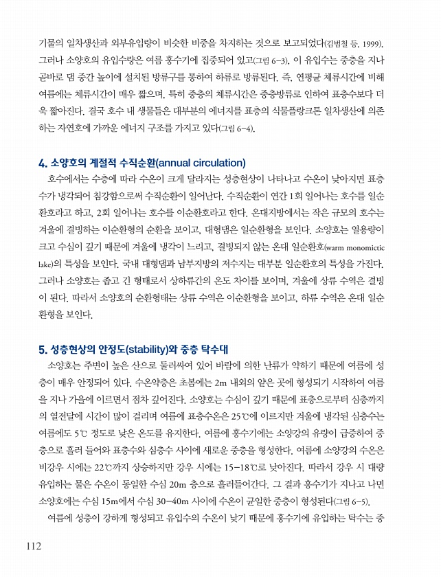 112 기물의 일차생산과 외부유입량이 비슷한 비중을 차지하는 것으로 보고되었다 김범철 등, 1999 그러나 소양호의 유입수량은 여름 홍수기에 집중되어 있고 그림 6-3 , 이 유입수는 중층을 지나 곧바로 댐 중간 높이에 설치된 방류구를 통하여 하류로 방류된다. 즉, 연평균 체류시간에 비해 여름에는 체류시간이 매우 짧으며, 특히 중층의 체류시간은 중층방류로 인하여 표층수보다 더 욱 짧아진다. 결국 호수 내 생물들은 대부분의 에너지를 표층의 식물플랑크톤 일차생산에 의존 하는 자연호에 가까운 에너지 구조를 가지고 있다 그림 6-4 4. 소양호의 계절적 수직순환 annual circulation 호수에서는 수층에 따라 수온이 크게 달라지는 성층현상이 나타나고 수온이 낮아지면 표층 수가 냉각되어 침강함으로써 수직순환...
