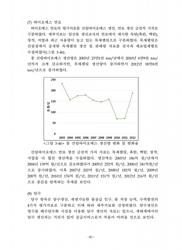 -91- 바이오매스 연료 바이오매스 연료의 평가지표를 산림바이오매스 생산 연료 생산 금전적 가치로 구분하였다 세부지표는 임산물 생산조사의 연료에서 제시한 목탄 흑탄 백탄 장작 지엽과 최근 사용량이 늘고 있는 목재펠릿으로 구분하였다 목재팰릿은 산림청에서 공개한 목재팰릿 생산 및 판매량 자료를 전국과 제조업체별로 수집하였다 그림 총 산림바이오매스 생산량은 년 만 천 년에서 년 만 천 년까지 크게 감소하지만 목재펠릿 생산량이 증가하면서 년 만 천 년으로 증가하였다 그림 총 산림바이오매스 생산량 변화 및 변화율 산림바이오매스 연료 생산 금전적 가치 지표는 목재펠릿 흑탄 백탄 장작 지엽을 다 합친 생산액을 수집하였다 생산액은 년 억 원 년에서 년 억 원 년으로 감소하였다가 년 억 원 년 년 억원 년 으로 증가하였다 ...
