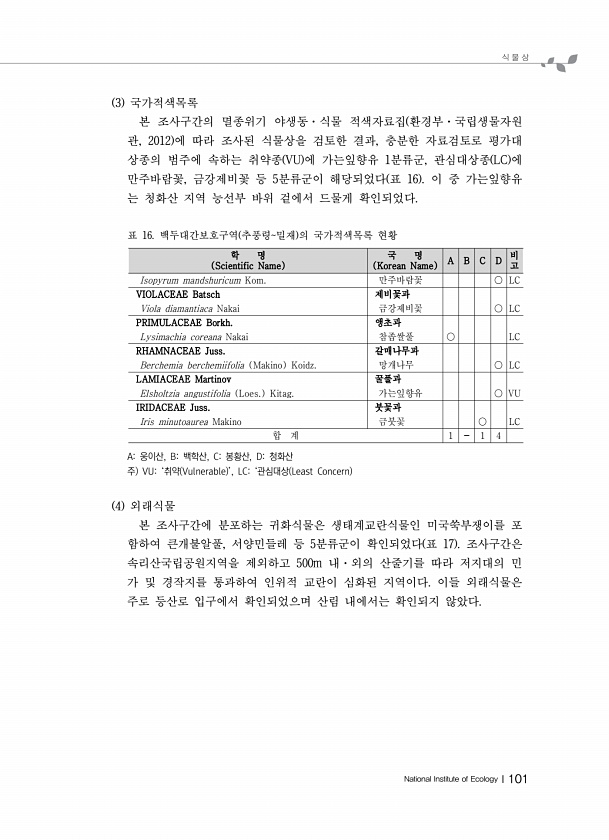 식 물 상 National Institute of EcologyⅠ101 3 국가적색목록 본 조사구간의 멸종위기 야생동·식물 적색자료집 환경부·국립생물자원 관, 2012 에 따라 조사된 식물상을 검토한 결과, 충분한 자료검토로 평가대 상종의 범주에 속하는 취약종 VU 에 가는잎향유 1분류군, 관심대상종 LC 에 만주바람꽃, 금강제비꽃 등 5분류군이 해당되었다 표 16 이 중 가는잎향유 는 청화산 지역 능선부 바위 겉에서 드물게 확인되었다. 표 16. 백두대간보호구역 추풍령밀재 의 국가적색목록 현황 학 명 Scientific Name 국 명 Korean Name A B C D 비 고 Isopyrum mandshuricum Kom. 만주바람꽃 ○ LC VIOLACEAE Batsch 제비꽃과 Viola diaman...