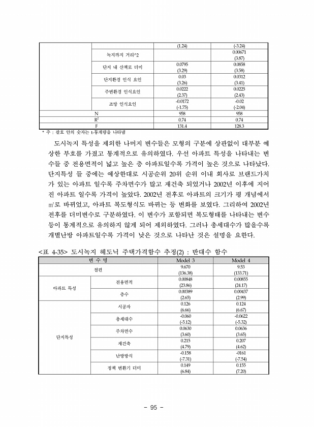 95 녹지까지 거리 단지 내 산책로 더미 단지환경 인식 요인 주변환경 인식요인 조망 인식요인 주 괄호 안의 숫자는 통계량을 나타냄 변 수 명 절편 아파트 특성 전용면적 층수 단지특성 시공자 총세대수 주차면수 재건축 난방방식 정책 변환기 더미 표 도시녹지 헤도닉 주택가격함수 추정 반대수 함수 도시녹지 특성을 제외한 나머지 변수들은 모형의 구분에 상관없이 대부분 예 상한 부호를 가졌고 통계적으로 유의하였다 우선 아파트 특성을 나타내는 변 수들 중 전용면적이 넓고 높은 층 아파트일수록 가격이 높은 것으로 나타났다 단지특성 들 중에는 예상한대로 시공순위 위 순위 이내 회사로 브랜드가치 가 있는 아파트 일수록 주차면수가 많고 재건축 되었거나 년 이후에 지어 진 아파트 일수록 가격이 높았다 년 전후로 아파트의 크기가 ...