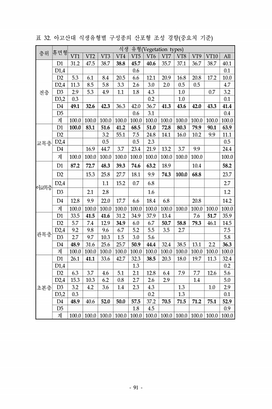 91 층위 휴면형 VT1 VT2 VT3 VT4 식생 유형 VT5 Vegetation types VT6 VT7 VT8 VT9 VT10 All 전층 D1 31.2 47.5 38.7 38.8 45.7 40.6 35.7 37.1 36.7 38.7 40.1 D1,4 0.6 0.1 D2 5.3 6.1 8.4 20.5 6.6 12.1 20.9 16.8 20.8 17.2 10.0 D2,4 11.3 8.5 5.8 3.3 2.6 3.0 2.0 0.5 0.5 4.7 D3 2.9 5.3 4.9 1.1 1.8 4.3 1.0 0.7 3.2 D3,2 0.3 0.2 1.0 0.1 D4 49.1 32.6 42.3 36.3 42.0 36.7 41.3 43.6 42.0 43.3 41.4 D5 0.6 3.1 0.4 계 100.0 100.0 1...