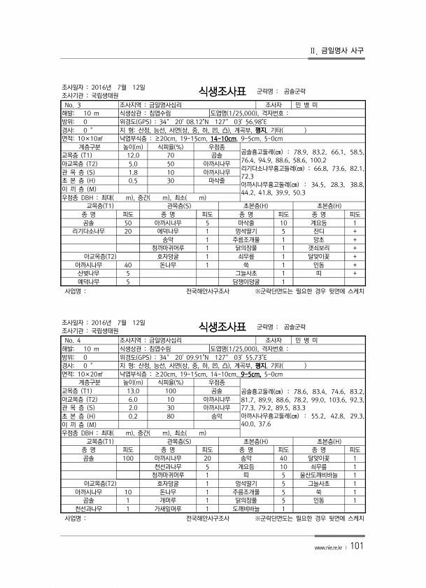 Ⅱ. 금일명사 사구 www.nie.re.kr ? 101 조사일자 2016년 7월 12일 조사기관 국립생태원 식생조사표 군락명 곰솔군락 No. 3 조사지역 금일명사십리 조사자 민 병 미 해발10 m 식생상관 침엽수림 도엽명 1/25,000 , 격자번호 방위0 위경도 GPS 34° 2008.12N 127° 0356.98E 경사0 ° 지 형산정, 능선, 사면 상, 중, 하, 凹, 凸 , 계곡부, 평지, 기타 면적10×10㎡ 낙엽부식층 ≥20cm, 19-15cm, 14-10cm, 9-5cm, 5-0cm 계층구분 높이 m 식피율 % 우점종 곰솔흉고둘레 ㎝ 78.9, 83.2, 66.1, 58.5, 76.4, 94.9, 88.6, 58.6, 100.2 리기다소나무흉고들레 ㎝ 66.8, 73.6, 82.1, 72.3 아...