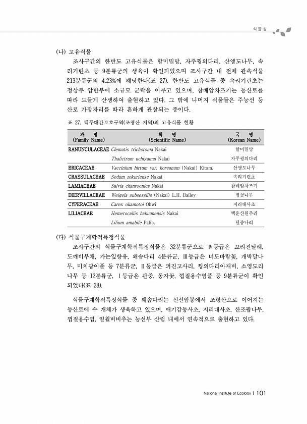 식 물 상 National Institute of EcologyⅠ101 나 고유식물 조사구간의 한반도 고유식물은 할미밀망, 자주꿩의다리, 산앵도나무, 속 리기린초 등 9분류군의 생육이 확인되었으며 조사구간 내 전체 관속식물 213분류군의 4.23%에 해당한다 표 27 한반도 고유식물 중 속리기린초는 정상부 암반부에 소규모 군락을 이루고 있으며, 참배암차즈기는 등산로를 따라 드물게 산생하여 출현하고 있다. 그 밖에 나머지 식물들은 주능선 등 산로 가장자리를 따라 흔하게 관찰되는 종이다. 과 명 Family Name 학 명 Scientific Name 국 명 Korean Name RANUNCULACEAE Clematis trichotoma Nakai 할미밀망 Thalictrum uchiyamai Nakai 자주...