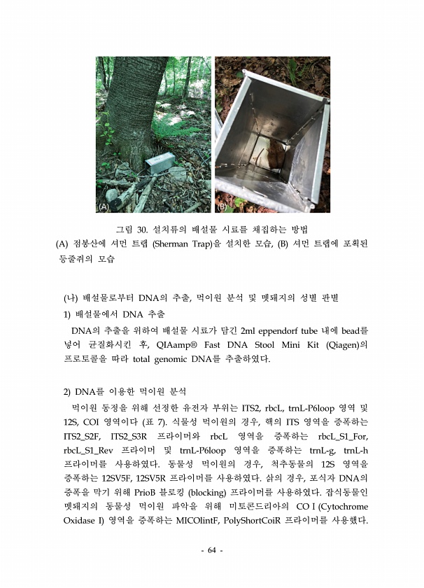 64 그림 30. 설치류의 배설물 시료를 채집하는 방법 A 점봉산에 셔먼 트랩 Sherman Trap 을 설치한 모습, B 셔먼 트랩에 포획된 등줄쥐의 모습 나 배설물로부터 DNA의 추출, 먹이원 분석 및 멧돼지의 성별 판별 1 배설물에서 DNA 추출 DNA의 추출을 위하여 배설물 시료가 담긴 2ml eppendorf tube 내에 bead를 넣어 균질화시킨 후, QIAamp® Fast DNA Stool Mini Kit Qiagen 의 프로토콜을 따라 total genomic DNA를 추출하였다. 2 DNA를 이용한 먹이원 분석 먹이원 동정을 위해 선정한 유전자 부위는 ITS2, rbcL, trnL-P6loop 영역 및 12S, COI 영역이다 표 7 식물성 먹이원의 경우, 핵의 ITS 영역을 증폭하는 IT...