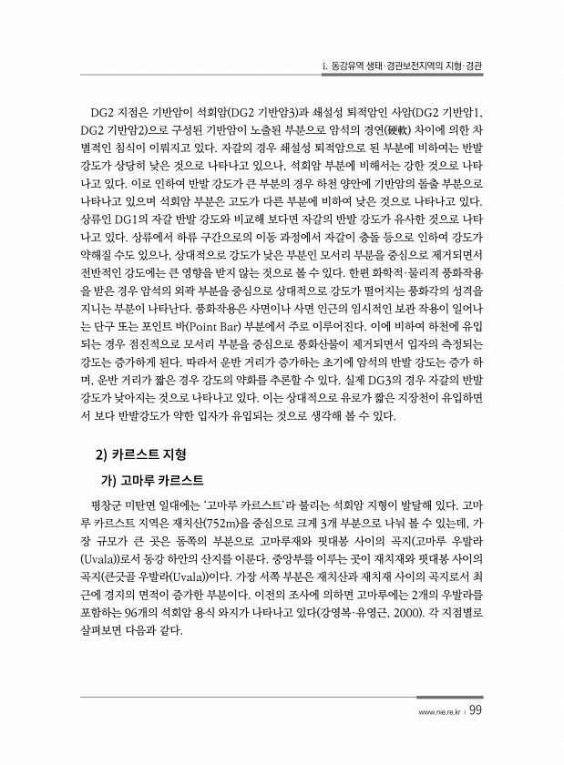 i. 동강유역 생태·경관보전지역의 지형·경관 www.nie.re.kr ? 99 DG2 지점은 기반암이 석회암 DG2 기반암3 과 쇄설성 퇴적암인 사암 DG2 기반암1, DG2 기반암2 으로 구성된 기반암이 노출된 부분으로 암석의 경연 硬軟 차이에 의한 차 별적인 침식이 이뤄지고 있다. 자갈의 경우 쇄설성 퇴적암으로 된 부분에 비하여는 반발 강도가 상당히 낮은 것으로 나타나고 있으나, 석회암 부분에 비해서는 강한 것으로 나타 나고 있다. 이로 인하여 반발 강도가 큰 부분의 경우 하천 양안에 기반암의 돌출 부분으로 나타나고 있으며 석회암 부분은 고도가 다른 부분에 비하여 낮은 것으로 나타나고 있다. 상류인 DG1의 자갈 반발 강도와 비교해 보다면 자갈의 반발 강도가 유사한 것으로 나타 나고 있다. 상류에서 하류...