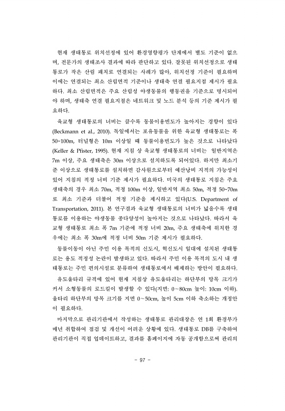 97 현재 생태통로 위치선정에 있어 환경영향평가 단계에서 별도 기준이 없으 며, 전문가의 생태조사 결과에 따라 판단하고 있다. 잘못된 위치선정으로 생태 통로가 작은 산림 패치로 연결되는 사례가 많아, 위치선정 기준이 필요하며 이에는 연결되는 최소 산림면적 기준이나 생태축 연결 필요지점 제시가 필요 하다. 최소 산림면적은 주요 산림성 야생동물의 행동권을 기준으로 명시되어 야 하며, 생태축 연결 필요지점은 네트워크 및 노드 분석 등의 기준 제시가 필 요하다. 육교형 생태통로의 너비는 클수록 동물이용빈도가 높아지는 경향이 있다 Beckmann et al., 2010 독일에서는 포유동물을 위한 육교형 생태통로는 폭 50100m, 터널형은 10m 이상일 때 동물이용빈도가 높은 것으로 나타났다 Keller & Pfis...