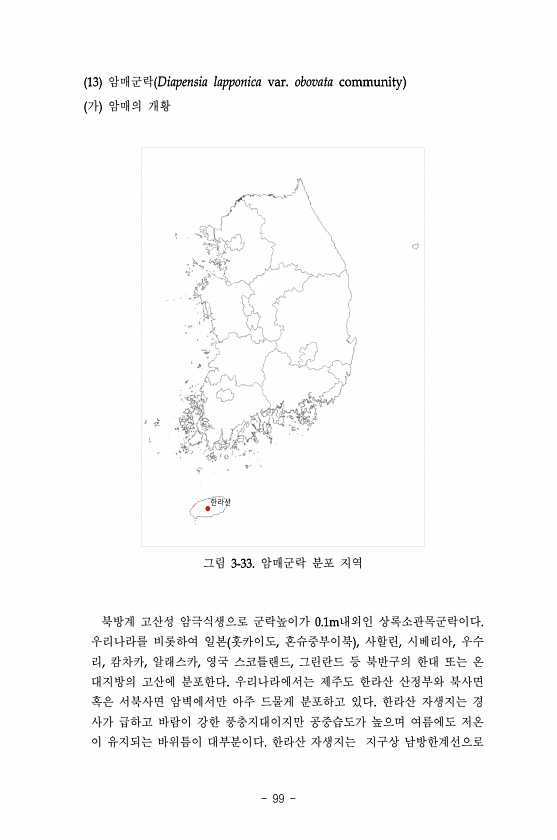 99 암매군락 가 암매의 개황 그림 암매군락 분포 지역 북방계 고산성 암극식생으로 군락높이가 내외인 상록소관목군락이다 우리나라를 비롯하여 일본 홋카이도 혼슈중부이북 사할린 시베리아 우수 리 캄차카 알래스카 영국 스코틀랜드 그린란드 등 북반구의 한대 또는 온 대지방의 고산에 분포한다 우리나라에서는 제주도 한라산 산정부와 북사면 혹은 서북사면 암벽에서만 아주 드물게 분포하고 있다 한라산 자생지는 경 사가 급하고 바람이 강한 풍충지대이지만 공중습도가 높으며 여름에도 저온 이 유지되는 바위틈이 대부분이다 한라산 자생지는 지구상남방한계선으로