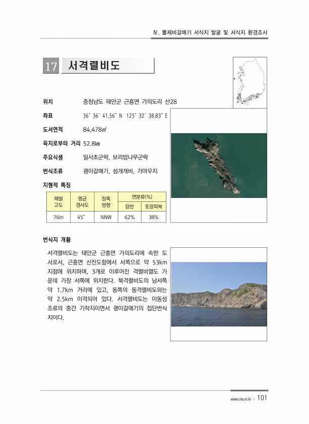 Ⅳ. 뿔제비갈매기 서식지 발굴 및 서식지 환경조사 www.nie.re.kr ? 101 17 서격렬비도 위치 충청남도 태안군 근흥면 가의도리 산28 좌표 36°36′41.56″N 125°32′38.83″E 도서면적 84,478㎡ 육지로부터 거리 52.8㎞ 주요식생 밀사초군락, 보리밥나무군락 번식조류 괭이갈매기, 섬개개비, 가마우지 지형적 특징 해발 고도 평균 경사도 장축 방향 면분류 % 암반 토양피복 76m 45° NNW 62% 38% 번식지 개황 서격렬비도는 태안군 근흥면 가의도리에 속한 도 서로서, 근흥면 신진도항에서 서쪽으로 약 53km 지점에 위치하며, 3개로 이루어진 격렬비열도 가 운데 가장 서쪽에 위치한다. 북격렬비도의 남서쪽 약 1.7km 거리에 있고, 동쪽의 동격렬비도와는 약 2.5km 이격되어...