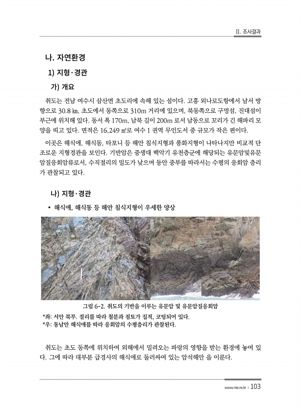 II. 조사결과 www.nie.re.kr ?103 1 · 취도는 전남 여수시 삼산면 초도리에 속해 있는 섬이다. 고흥 외나로도항에서 남서 방 향으로 30.8 ㎞, 초도에서 동쪽으로 310m 거리에 있으며, 북동쪽으로 구멍섬, 진대섬이 부근에 위치해 있다. 동서 폭 170m, 남북 길이 200m 로서 남동으로 꼬리가 긴 해파리 모 양을 띠고 있다. 면적은 16,249 ㎡로 여수 1 권역 무인도서 중 규모가 작은 편이다. 이곳은 해식애, 해식동, 타포니 등 해안 침식지형과 풍화지형이 나타나지만 비교적 단 조로운 지형경관을 보인다. 기반암은 중생대 백악기 유천층군에 해당되는 유문암및유문 암질응회암류로서, 수직절리의 밀도가 낮으며 동안 중부를 따라서는 수평의 응회암 층리 가 관찰되고 있다. · ? 해식애, 해식동 ...