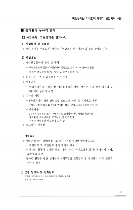 국립생태원 지역협력 중장기 발전계획 수립 101 ■ 생태환경 동아리 운영 □ 사업유형국립생태원 연계사업 □ 사업배경 및 필요성 ㅇ 생태·환경을 주제로 한 서천군 지역민들의 미디어동아리 활동 활성화 지원 □ 사업개요 ㅇ 생태환경동아리 구성 및 운영 국립생태원·서천군미디어문화센터 공동으로 생태 미디어 동아리 구성 청소년영상동아리 및 생태 라디오동아리 등 ㅇ 대상인근 초·중·고등학생 우선 선정 ㅇ 사업내용 국립생태원과 서천군미디어문화센터가 협업, 서천군 관내 학생 대상의 생 태미디어 동아리 구성 ㅇ 기관별 역할 국립생태원 생태 관련교육 프로그램 마련 및 전시장소 제공 서천군미디어문화센터 미디어제작 교육 시나리오,촬영, 편집 등 주요내용 ·3개권역 생태환경 조사생태원주변, 금강하구주변, 서해안 갯벌주변 ·생태환경 ...