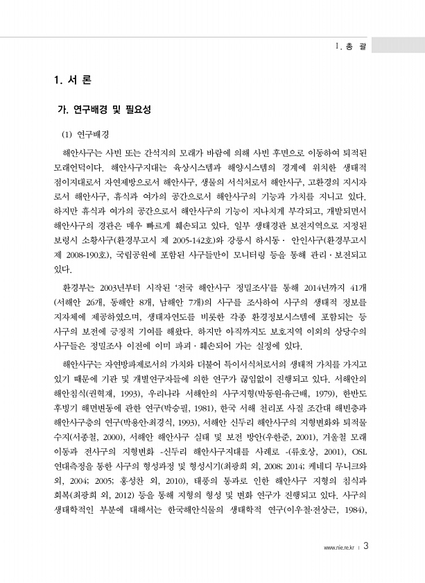Ⅰ. 총 괄 www.nie.re.kr ? 3 1. 서 론 가. 연구배경 및 필요성 1 연구배경 해안사구는 사빈 또는 간석지의 모래가 바람에 의해 사빈 후면으로 이동하여 퇴적된 모래언덕이다. 해안사구지대는 육상시스템과 해양시스템의 경계에 위치한 생태적 점이지대로서 자연제방으로서 해안사구, 생물의 서식처로서 해안사구, 고환경의 지시자 로서 해안사구, 휴식과 여가의 공간으로서 해안사구의 기능과 가치를 지니고 있다. 하지만 휴식과 여가의 공간으로서 해안사구의 기능이 지나치게 부각되고, 개발되면서 해안사구의 경관은 매우 빠르게 훼손되고 있다. 일부 생태경관 보전지역으로 지정된 보령시 소황사구 환경부고시 제 2005-142호 와 강릉시 하시동· 안인사구 환경부고시 제 2008-190호 , 국립공원에 포함된 사구들만이 ...