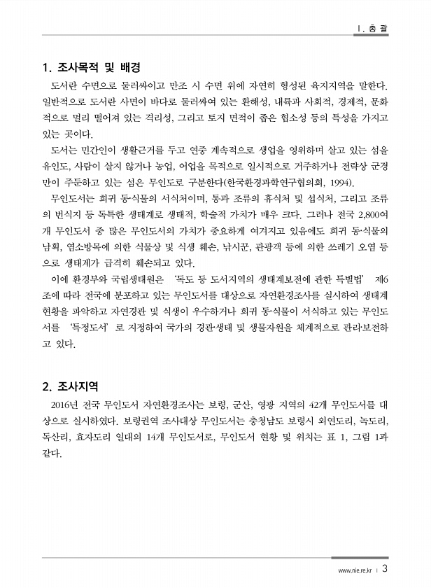 Ⅰ. 총 괄 www.nie.re.kr ? 3 1. 조사목적 및 배경 도서란 수면으로 둘러싸이고 만조 시 수면 위에 자연히 형성된 육지지역을 말한다. 일반적으로 도서란 사면이 바다로 둘러싸여 있는 환해성, 내륙과 사회적, 경제적, 문화 적으로 멀리 떨어져 있는 격리성, 그리고 토지 면적이 좁은 협소성 등의 특성을 가지고 있는 곳이다. 도서는 민간인이 생활근거를 두고 연중 계속적으로 생업을 영위하며 살고 있는 섬을 유인도, 사람이 살지 않거나 농업, 어업을 목적으로 일시적으로 거주하거나 전략상 군경 만이 주둔하고 있는 섬은 무인도로 구분한다 한국환경과학연구협의회, 1994 무인도서는 희귀 동?식물의 서식처이며, 통과 조류의 휴식처 및 섭식처, 그리고 조류 의 번식지 등 독특한 생태계로 생태적, 학술적 가치가 매...