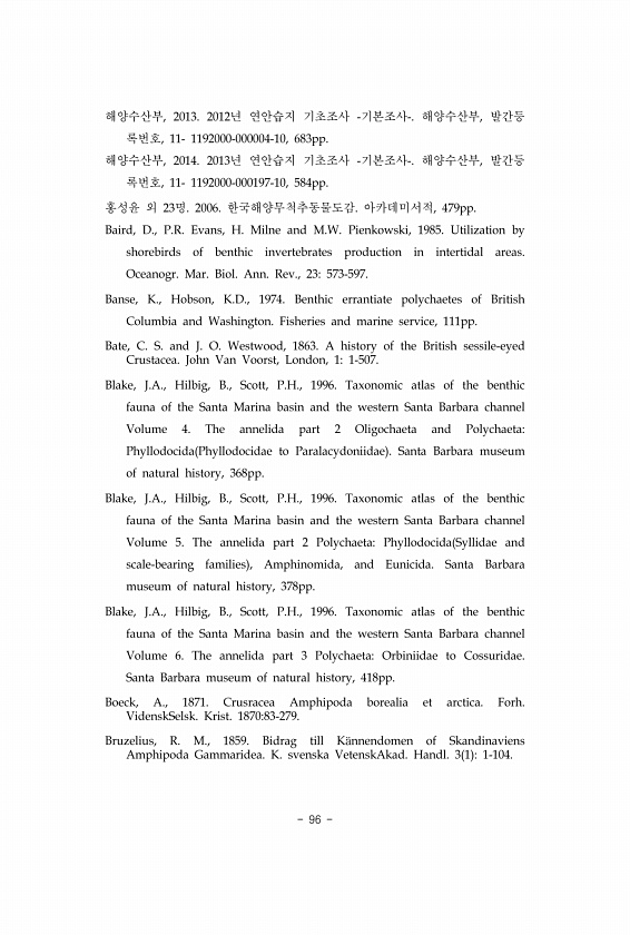 96 해양수산부, 2013. 2012년 연안습지 기초조사 -기본조사-. 해양수산부, 발간등 록번호, 11- 1192000-000004-10, 683pp. 해양수산부, 2014. 2013년 연안습지 기초조사 -기본조사-. 해양수산부, 발간등 록번호, 11- 1192000-000197-10, 584pp. 홍성윤 외 23명. 2006. 한국해양무척추동물도감. 아카데미서적, 479pp. Baird, D., P.R. Evans, H. Milne and M.W. Pienkowski, 1985. Utilization by shorebirds of benthic invertebrates production in intertidal areas. Oceanogr. Mar. Biol. Ann. Rev., 23573-597. B...