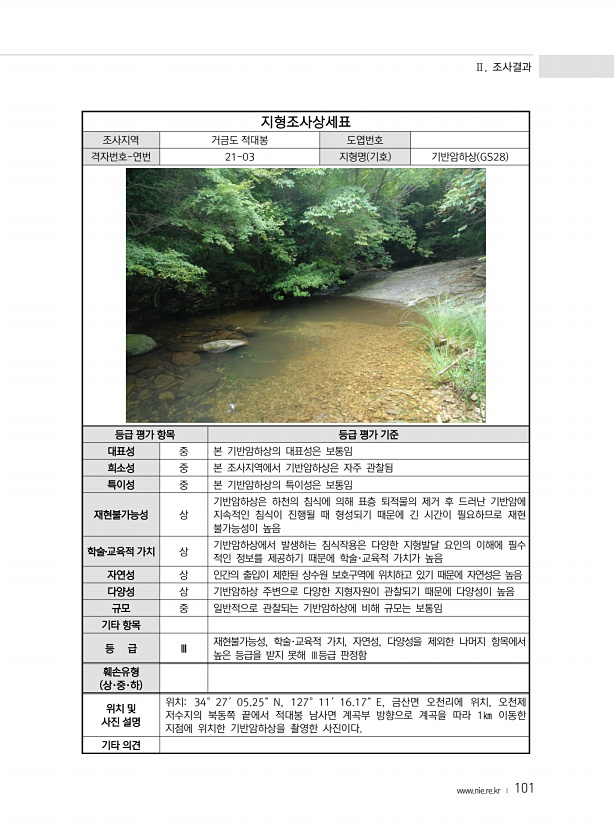 Ⅱ. 조사결과 www.nie.re.kr ? 101 지형조사상세표 조사지역 거금도 적대봉 도엽번호 격자번호-연번 21-03 지형명 기호 기반암하상 GS28 등급 평가 항목 등급 평가 기준 대표성 중 본 기반암하상의 대표성은 보통임 희소성 중 본 조사지역에서 기반암하상은 자주 관찰됨 특이성 중 본 기반암하상의 특이성은 보통임 재현불가능성 상 기반암하상은 하천의 침식에 의해 표층 퇴적물의 제거 후 드러난 기반암에 지속적인 침식이 진행될 때 형성되기 때문에 긴 시간이 필요하므로 재현 불가능성이 높음 학술?교육적 가치 상 기반암하상에서 발생하는 침식작용은 다양한 지형발달 요인의 이해에 필수 적인 정보를 제공하기 때문에 학술·교육적 가치가 높음 자연성 상 인간의 출입이 제한된 상수원 보호구역에 위치하고 있기 때문에 자...