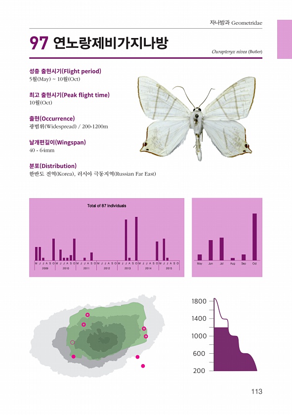 113 자나방과 Geometridae 성충 출현시기 Flight period 5월 May 10월 Oct 최고 출현시기 Peak fight time 10월 Oct 출현 Occurrence 광범위 Widespread 200-1200m 날개편길이 Wingspan 40 64mm 분포 Distribution 한반도 전역 Korea , 러시아 극동지역 Russian Far East Ourapteryx nivea Butler M J J A S O M J J A S O M J J A S O M J J A S O M J J A S O M J J A S O M J J A S O May Jun Jul Aug Sep Oct 2009 2010 2011 2012 2013 2014 2015 Total of 87 individuals ...