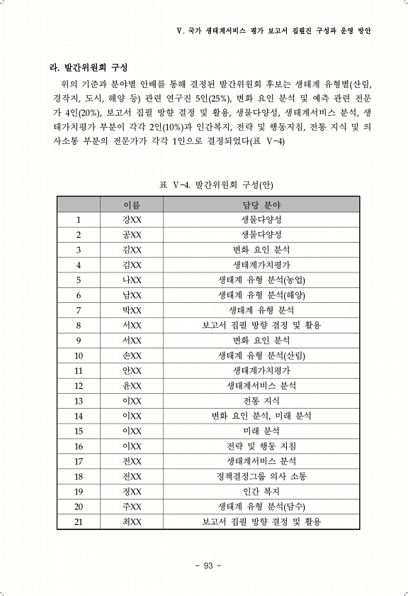 Ⅴ. 국가 생태계서비스 평가 보고서 집필진 구성과 운영 방안 93 라. 발간위원회 구성 위의 기준과 분야별 안배를 통해 결정된 발간위원회 후보는 생태계 유형별 산림, 경작지, 도시, 해양 등 관련 연구진 5인 25% , 변화 요인 분석 및 예측 관련 전문 가 4인 20% , 보고서 집필 방향 결정 및 활용, 생물다양성, 생태계서비스 분석, 생 태가치평가 부분이 각각 2인 10% 과 인간복지, 전략 및 행동지침, 전통 지식 및 의 사소통 부분의 전문가가 각각 1인으로 결정되었다 표 Ⅴ 4 이름 담당 분야 1 강XX 생물다양성 2 공XX 생물다양성 3 김XX 변화 요인 분석 4 김XX 생태계가치평가 5 나XX 생태계 유형 분석 농업 6 남XX 생태계 유형 분석 해양 7 박XX 생태계 유형 분석 8 서XX 보고서...