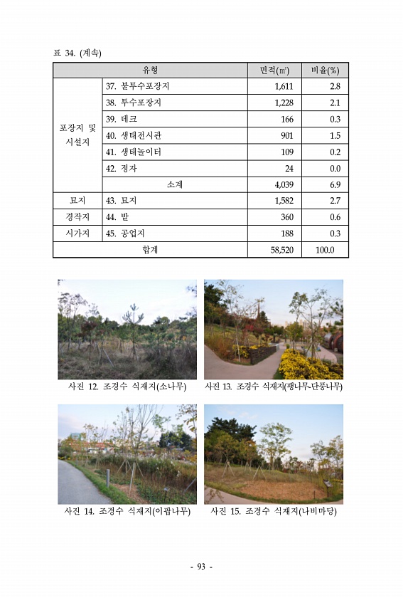 표 34. 계속 유형 면적 ㎡ 비율 % 포장지 및 시설지 37. 불투수포장지 1,611 2.8 38. 투수포장지 1,228 2.1 39. 데크 166 0.3 40. 생태전시관 901 1.5 41. 생태놀이터 109 0.2 42. 정자 24 0.0 소계 4,039 6.9 묘지 43. 묘지 1,582 2.7 경작지 44. 밭 360 0.6 시가지 45. 공업지 188 0.3 합계 58,520 100.0 사진 12. 조경수 식재지 소나무 사진 13. 조경수 식재지 팽나무-단풍나무 사진 14. 조경수 식재지 이팝나무 사진 15. 조경수 식재지 나비마당 93