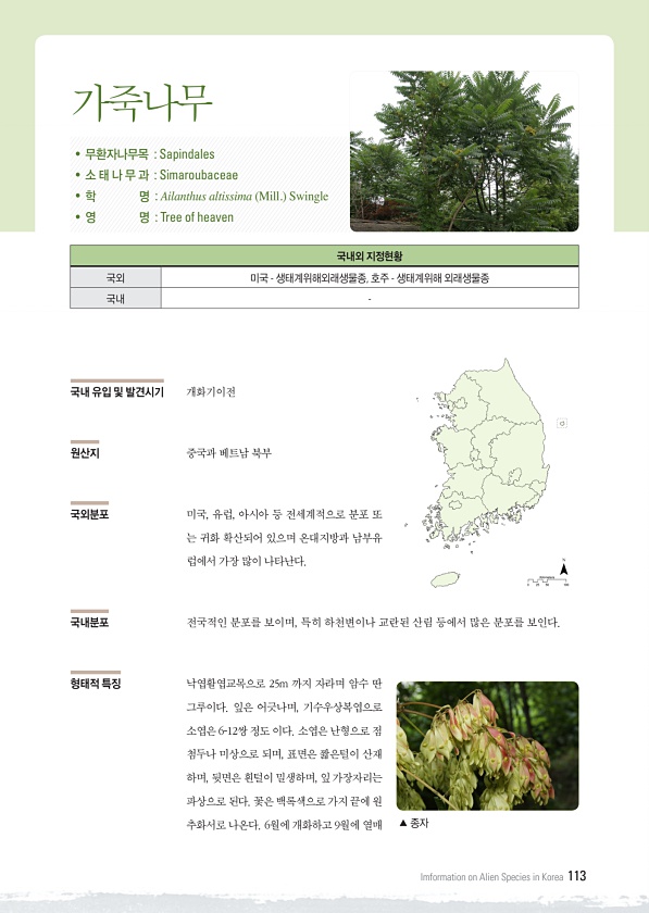 포유류 양서류 · 파충류 담수어류 곤충류 연체동물 외래식물 Imformation on Alien Species in Korea 113 국내 유입 및 발견시기 개화기이전 원산지 중국과 베트남 북부 국외분포 미국, 유럽, 아시아 등 전세계적으로 분포 또 는 귀화 확산되어 있으며 온대지방과 남부유 럽에서 가장 많이 나타난다. 국내분포 전국적인 분포를 보이며, 특히 하천변이나 교란된 산림 등에서 많은 분포를 보인다. 형태적 특징 낙엽활엽교목으로 25m 까지 자라며 암수 딴 그루이다. 잎은 어긋나며, 기수우상복엽으로 소엽은 6-12쌍 정도 이다. 소엽은 난형으로 점 첨두나 미상으로 되며, 표면은 짧은털이 산재 하며, 뒷면은 흰털이 밀생하며, 잎 가장자리는 파상으로 된다. 꽃은 백록색으로 가지 끝에 원 추화서로 나온다...
