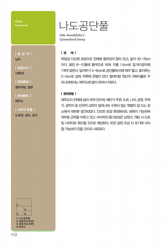 112 ① ② ③ ④ ① 나도공단풀 ② 생육지 도로변 ③ 생육지 도로변 ④ 분포도 | 생 태 | 목질성 다년생 초본으로 전체에 별모양의 털이 있고, 높이 30∼70cm 이다. 꽃은 8∼10월에 황색으로 피며, 지름 1.5cm로 잎겨드랑이에 1개씩 달린다. 잎자루가 3∼6mm로 공단풀에 비해 매우 짧고, 꽃자루는 2∼5cm로 길며, 위쪽에 관절이 있다. 열대지방 원산의 귀화식물로 우 리나라에서는 제주도에 많이 퍼져서 자란다. | 분포현황 | 제주도의 전체에 널리 퍼져 있으며, 해안가 주변, 도로, 나지, 공원, 주택 가, 경작지 등 인위적 교란이 일어나며, 수목이 없는 햇볕이 잘 드는 장 소에서 대부분 발견되었다. 건조한 토양 환경에서도 생육이 가능하며 대부분 군락을 이루고 있고 서식처의 종다양성은 낮았다. ...