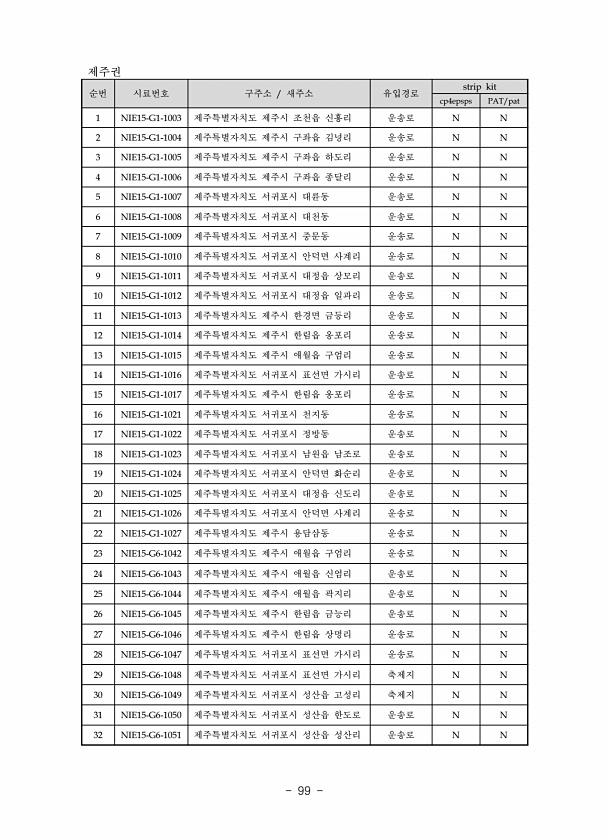 제주권 순번 시료번호 구주소 새주소 유입경로 strip kit cp4epsps PAT/pat 1 NIE15-G1-1003 제주특별자치도 제주시 조천읍 신흥리 운송로 N N 2 NIE15-G1-1004 제주특별자치도 제주시 구좌읍 김녕리 운송로 N N 3 NIE15-G1-1005 제주특별자치도 제주시 구좌읍 하도리 운송로 N N 4 NIE15-G1-1006 제주특별자치도 제주시 구좌읍 종달리 운송로 N N 5 NIE15-G1-1007 제주특별자치도 서귀포시 대륜동 운송로 N N 6 NIE15-G1-1008 제주특별자치도 서귀포시 대천동 운송로 N N 7 NIE15-G1-1009 제주특별자치도 서귀포시 중문동 운송로 N N 8 NIE15-G1-1010 제주특별자치도 서귀포시 안덕면 사계리 운송로 N N 9 NI...