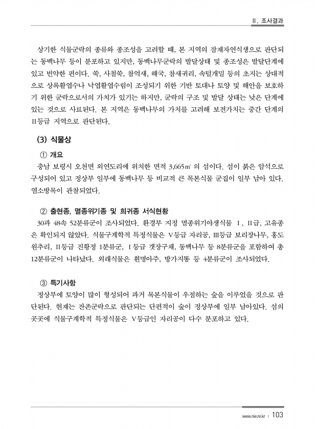 Ⅱ. 조사결과 www.nie.re.kr ? 103 상기한 식물군락의 종류와 종조성을 고려할 때, 본 지역의 잠재자연식생으로 판단되 는 동백나무 등이 분포하고 있지만, 동백나무군락의 발달상태 및 종조성은 발달단계에 있고 빈약한 편이다. 쑥, 사철쑥, 참억새, 해국, 참새귀리, 속털개밀 등의 초지는 상대적 으로 상록활엽수나 낙엽활엽수림이 조성되기 위한 기반 토대나 토양 및 해안을 보호하 기 위한 군락으로서의 가치가 있기는 하지만, 군락의 구조 및 발달 상태는 낮은 단계에 있는 것으로 사료된다. 본 지역은 동백나무의 가치를 고려해 보전가치는 중간 단계의 Ⅱ등급 지역으로 판단된다. 3 식물상 ① 개요 충남 보령시 오천면 외연도리에 위치한 면적 3,665㎡ 의 섬이다. 섬이 붉은 암석으로 구성되어 있고 정상부 일부에...