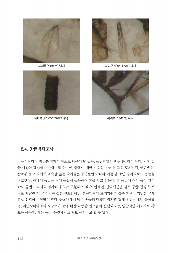 112 국가장기생태연구 파리목 diptera 날개 나비목 lepidoptera 의 유충 각다구과 tipulidae 날개 파리목 diptera 다리 8.4. 동굴박쥐조사 우리나라 박쥐들은 잠자리 장소로 나무의 빈 공동, 동굴바깥의 바위 틈, 다리 아래, 처마 밑 등 다양한 장소를 이용하기도 하지만, 동굴에 대한 선호성이 높다. 특히 토기박쥐, 붉은박쥐, 관박쥐 등 우리에게 익숙한 많은 박쥐들은 동면뿐만 아니라 여름 낮 동안 잠자리로도 동굴을 선호한다. 하나의 동굴은 여러 종들이 공유하여 잠을 자고 있는데, 한 동굴에 여러 종이 있더 라도 종별로 각각의 잠자리 위치가 구분되어 있다. 일테면, 관박쥐같은 경우 동굴 천장에 거 꾸로 매달린 채 잠을 자는 것을 선호한다면, 붉은박쥐와 토끼박쥐의 경우 동굴의 벽면을 잠...
