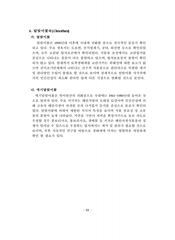 93 6. 달맞이꽃속 Oenothera 가. 달맞이꽃 달맞이꽃은 1890년대 이후에 국내에 귀화한 종으로 전국적인 분포가 확인 되고 있다. 주요 생육지는 도로변, 산지절재기, 공터, 하천변 등으로 확인되었 으며, 모두 교란된 입지조건에서 확인되었다. 식물종 조성에서도 교란입지를 중심으로 나타나는 종들이 다수 출현하고 있으며, 법적보호종의 출현이 확인 되지 않고 있다. 현재까지 토착생태계를 교란시키는 위해성에 대한 보고가 없 으며 천이초기단계에서 나타나는 선구적 식물종으로 판단되므로 특별한 제거 및 관리방안 수립이 불필요 할 것으로 보이며 잠재적으로 달맞이꽃 서식처에 서의 인간간섭이 최소화 된다면 쉽게 다른 식생으로 변화될 것으로 보인다. 나. 애기달맞이꽃 애기달맞이꽃은 북미원산의 귀화종으로 국내에는 1961...