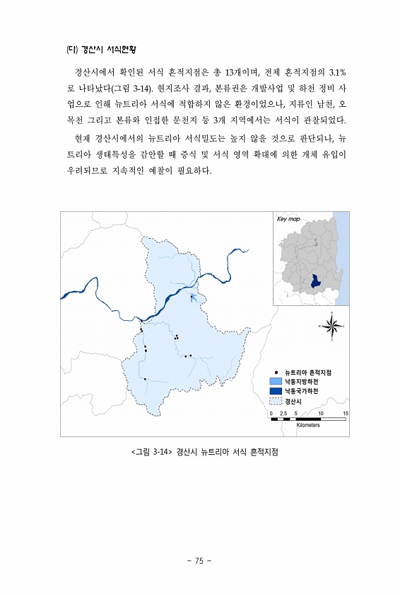 경산시에서 확인된 서식 흔적지점은 총 13개이며, 전체 흔적지점의 3.1% 로 나타났다 그림 3-14 현지조사 결과, 본류권은 개발사업 및 하천 정비 사 업으로 인해 뉴트리아 서식에 적합하지 않은 환경이었으나, 지류인 남천, 오 목천 그리고 본류와 인접한 문천지 등 3개 지역에서는 서식이 관찰되었다. 현재 경산시에서의 뉴트리아 서식밀도는 높지 않을 것으로 판단되나, 뉴 트리아 생태특성을 감안할 때 증식 및 서식 영역 확대에 의한 개체 유입이 우려되므로 지속적인 예찰이 필요하다. ?? ? ? ??