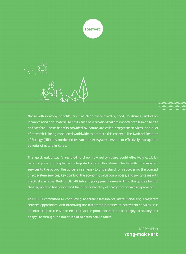 61 식물 88종 조름나물 Ⅱ급 죽절초 Ⅱ급 지네발란 Ⅱ급 생물정보 바로가기 생물정보 바로가기 생물정보 바로가기 부 록5ines, and other resources and non-material benefts such as recreation that are important to human health and welfare. These benefts provided by nature are called ecosystem services, and a lot of research is being conducted worldwide to promote this concept. The National Institute of Ecology NIE has conducted research on ecosystem s...