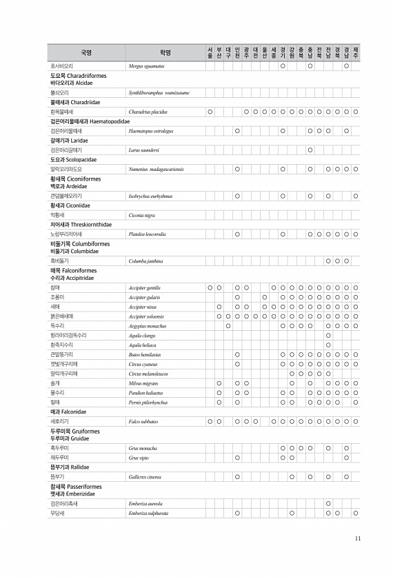 11 호사비오리 Mergus sguamatus ○ ○ ○ 도요목 Charadriiformes 바다오리과 Alcidae 뿔쇠오리 Synthliboramphus wumizusume 물떼새과 Charadriidae 흰목물떼새 Charadrius placidus ○ ○ ○ ○ ○ ○ ○ ○ ○ ○ ○ ○ ○ ○ 검은머리물떼새과 Haematopodidae 검은머리물떼새 Haematopus ostralegus ○ ○ ○ ○ ○ ○ 갈매기과 Laridae 검은머리갈매기 Larus saundersi ○ 도요과 Scolopacidae 알락꼬리마도요 Numenius madagascariensis ○ ○ ○ ○ ○ ○ ○ 황새목 Ciconiiformes 백로과 Ardeidae 큰덤불해오라기 Ixobrychus eurhythmu...