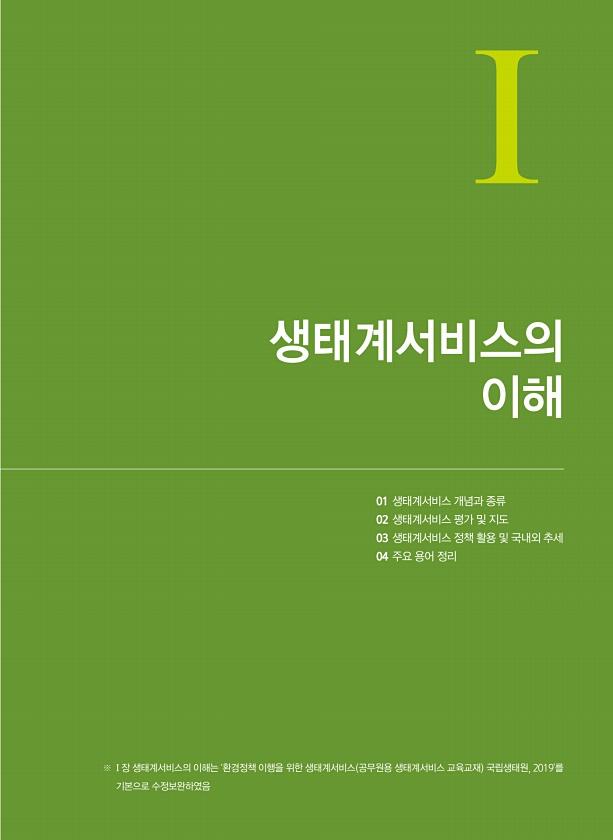 생태계서비스의 이해 01 생태계서비스 개념과 종류 02 생태계서비스 평가 및 지도 03 생태계서비스 정책 활용 및 국내외 추세 04 주요 용어 정리 ※ I 장 생태계서비스의 이해는 ‘환경정책 이행을 위한 생태계서비스 공무원용 생태계서비스 교육교재 국립생태원, 2019’를 기본으로수정보완하였음